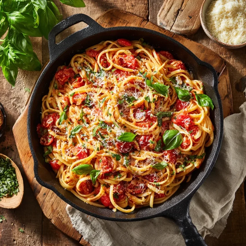 This pasta is as simple as tossing everything—pasta, tomatoes, garlic, basil, and broth—into one pot and letting it simmer. As the pasta cooks, it absorbs the flavors of the sauce, resulting in a rich and aromatic dish. A drizzle of olive oil and a sprinkle of Parmesan at the end make it feel special. It’s fresh, fast, and always a crowd-pleaser. A true recipe to keep in your weekly rotation when time is short.