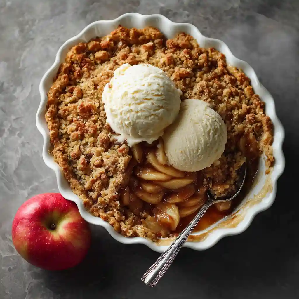 Allow the apple crumble to cool for a few minutes before serving. This dish is perfect on its own, but for extra indulgence, serve it with a scoop of vanilla ice cream or a dollop of whipped cream.