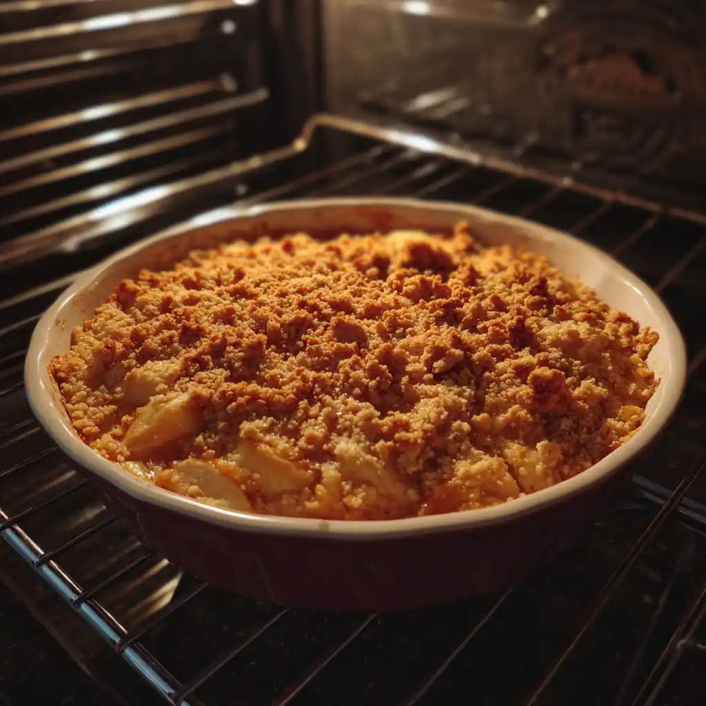 Place the baking dish in the oven and bake for 35-40 minutes, or until the apples are tender and the topping is golden brown. The crumble should be bubbling around the edges, indicating that it’s ready.