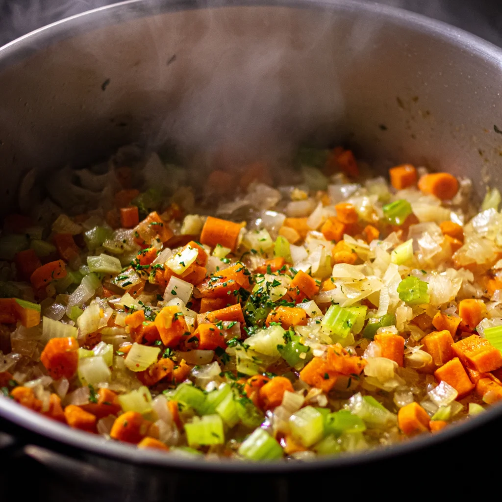 In a large pot, heat olive oil over medium heat. Add onion and cook until soft and slightly golden. Stir in garlic, carrots, and celery. Cook for about 4 minutes until fragrant.