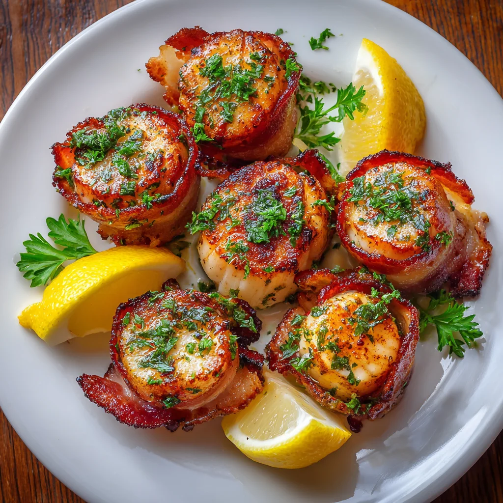 5. Bake – Place scallops on the prepared baking sheet, spacing them out. Bake for 12–15 minutes until scallops are opaque and bacon is crisp.