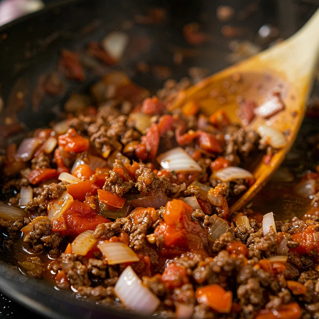 While the pasta is cooking, heat olive oil in a large skillet over medium heat. Add the chopped onion and sauté for 3–4 minutes until softened. Add the garlic and cook for 30 seconds more. Add the ground beef or sausage, breaking it up as it cooks. Once browned, drain the fat, then stir in the marinara sauce, salt, pepper, and Italian seasoning. Let it simmer for 5–7 minutes to allow the flavors to meld.