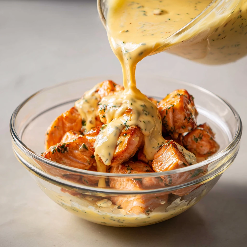 Once the salmon is done (it should be firm but still moist), transfer it to a bowl while it’s still hot. Pour the bang bang sauce over the bites and toss gently to coat them completely.