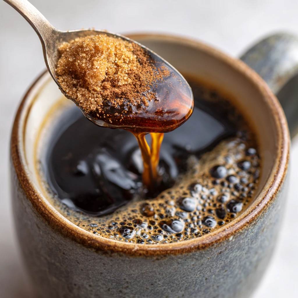 Step 2: Mix the syrup. Put your brown sugar and cinnamon into the bottom of your mug. Pour the hot coffee right over them. Stir it well. I think the heat helps the sugar melt into a syrup. It should look dark and glossy.