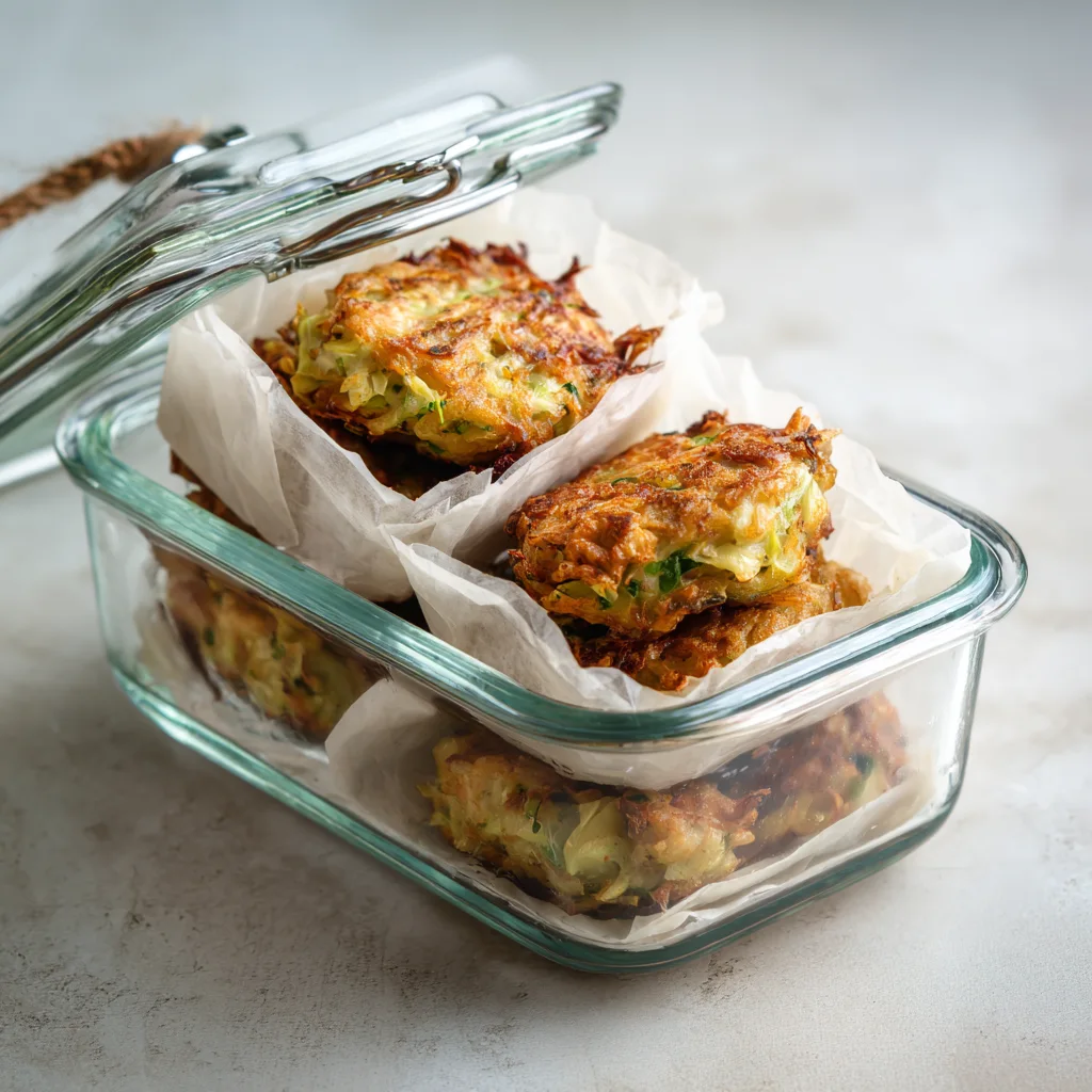 Place the cooled fritters in an airtight container. They will last in the fridge for about 3 days.