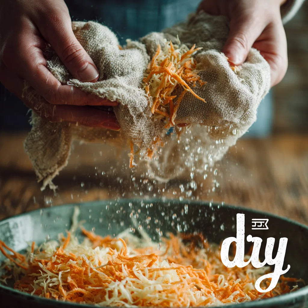 The SqueezeThe number one rule for crispy fritters is removing water. Squeeze the boiled cabbage and carrots like a towel before mixing!