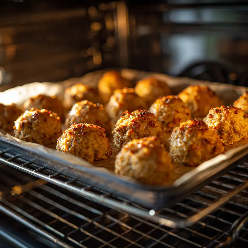 Bake the sausage balls in the preheated oven for 20-25 minutes, or until they are golden brown and cooked through. You can check the internal temperature with a meat thermometer; it should reach 160°F (71°C).