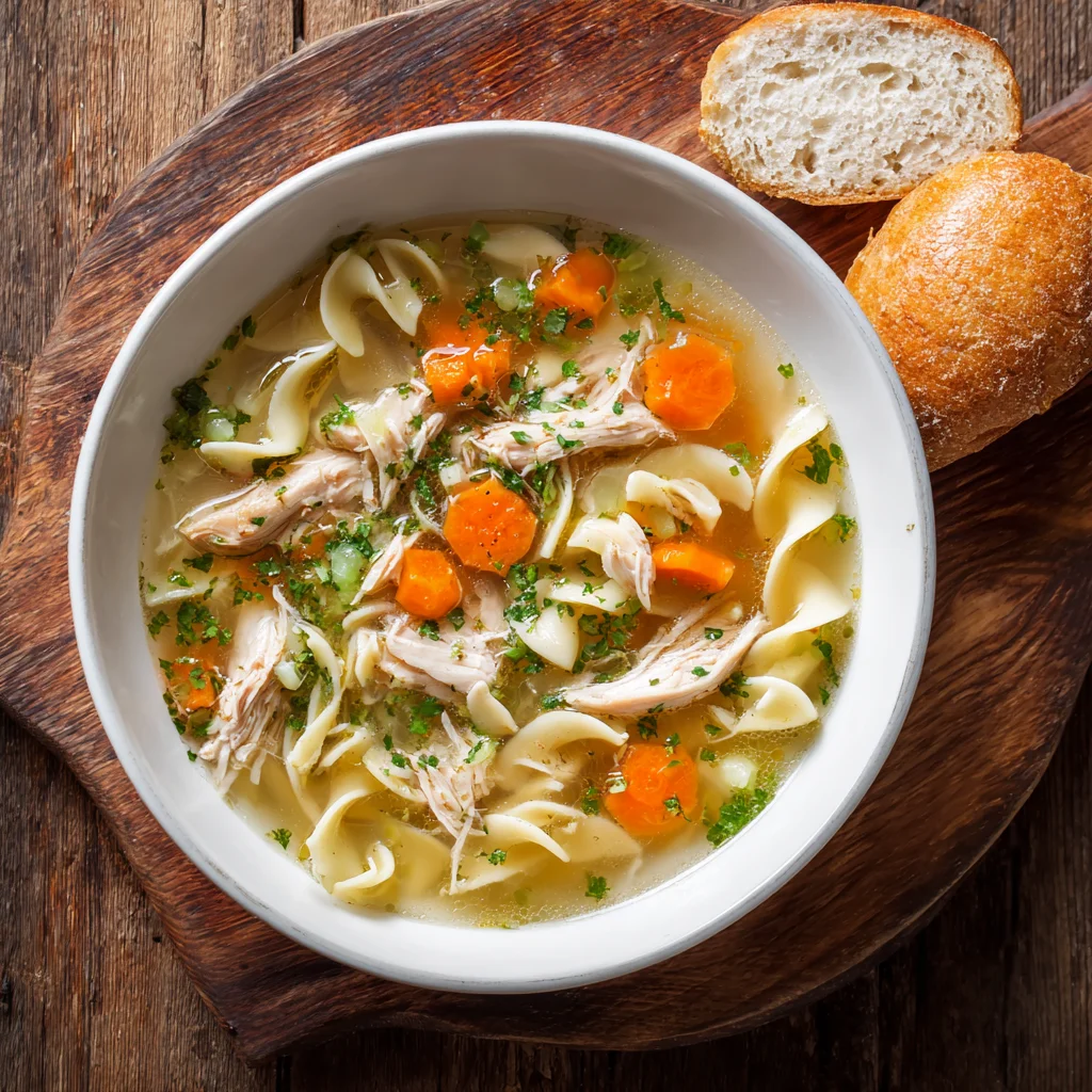 Chicken noodle soup is perfect on its own, but you can elevate it with a side of crusty bread, crackers, or a green salad. For a fun twist, serve it with grilled cheese sandwiches for a classic comfort food combo.