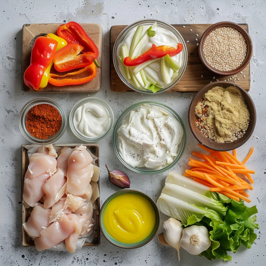 Spread a big spoonful of your homemade shawarma sauce on the tortilla. Add some chili garlic sauce if you like heat. Pile on the cooked chicken, then the bell peppers, onions, lettuce, and those tangy gherkins.