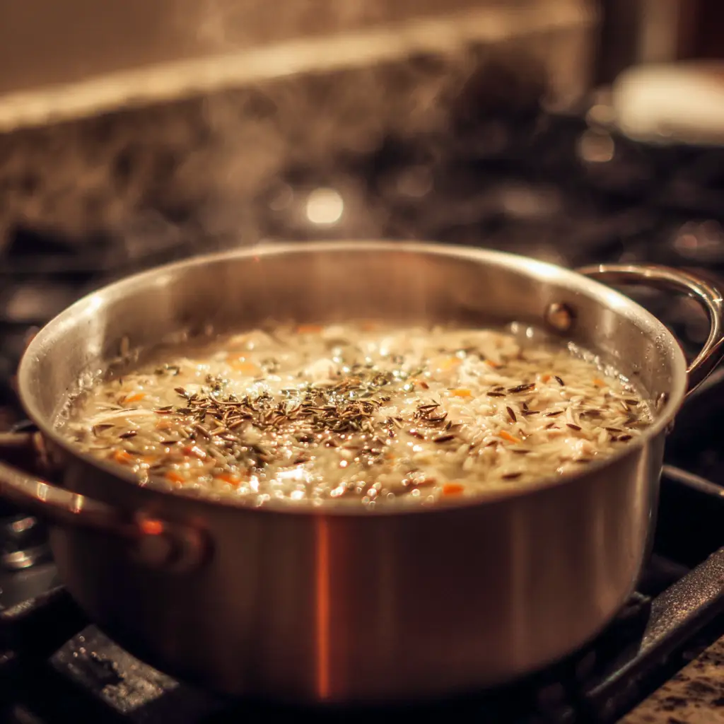 Pour in the wild rice. It cooks right in the pot. This helps the broth taste richer.