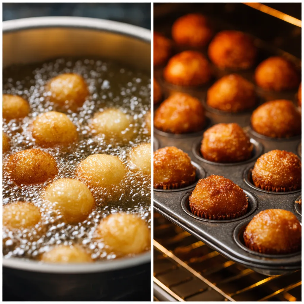 Step 4: Scoop and cook. Drop small balls of dough into the tin or the hot oil. If you fry them, they only need about 2 minutes per side. If you bake them, give them about 10 to 12 minutes. They should feel springy when you touch the top.