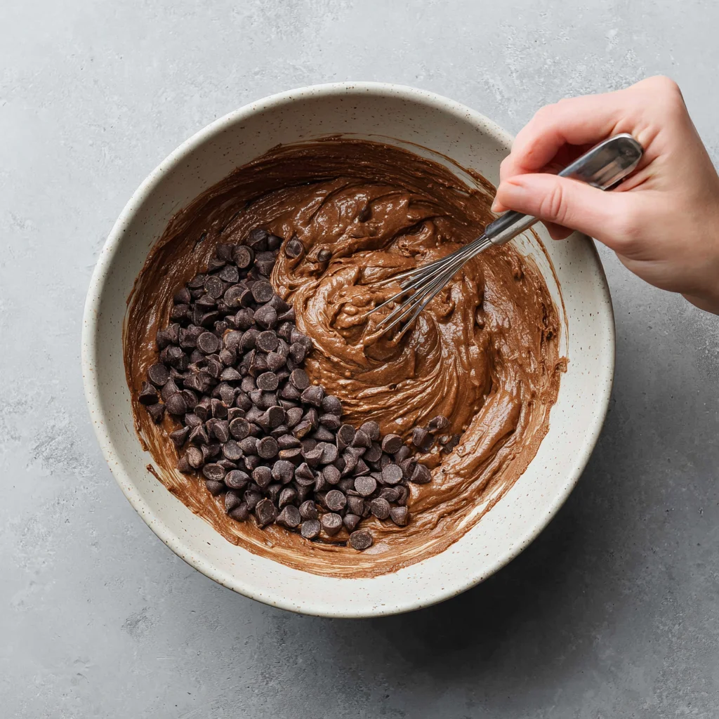 - Fold in the semi-sweet chocolate chips for extra chocolatey goodness.