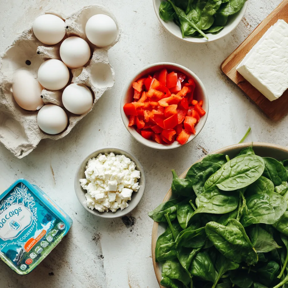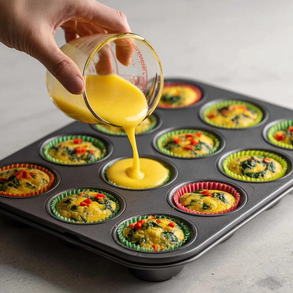 Don’t pour the egg mix yet! First, divide your chopped spinach, diced red peppers, and crumbled feta cheese evenly into the muffin cups.