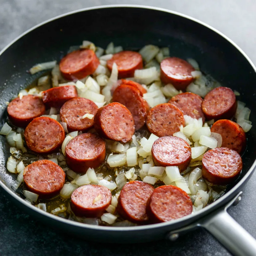 3. Quick Sauté (Recommended): In a large skillet, melt the butter. Add the sliced kielbasa and diced onion. Cook them over medium heat for about 5 to 7 minutes. This step makes the sausage pieces a little crispy and softens the onion. This step is not mandatory, but trust me, it tastes better!