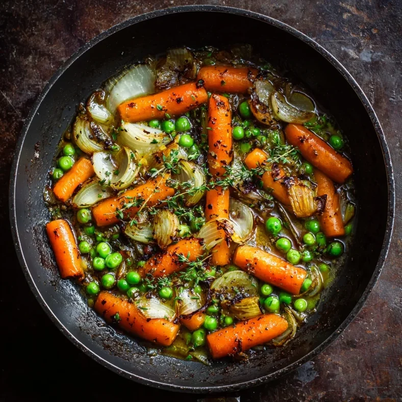In the same pan, add another tablespoon of oil. Sauté the chopped onion, carrots, and garlic for about 3-4 minutes, until the vegetables are soft and fragrant. Add in the peas and cook for another 2 minutes. The key here is to cook the vegetables until they’re tender but still have some bite left to them.
