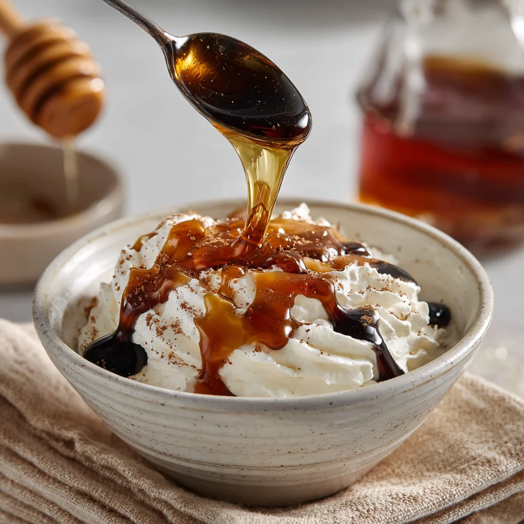 In another bowl, whip the heavy cream until soft peaks form. Add your secret ingredient — that drizzle of maple syrup — and whip just until it blends in. Fold this whipped cream gently into the pudding mixture.