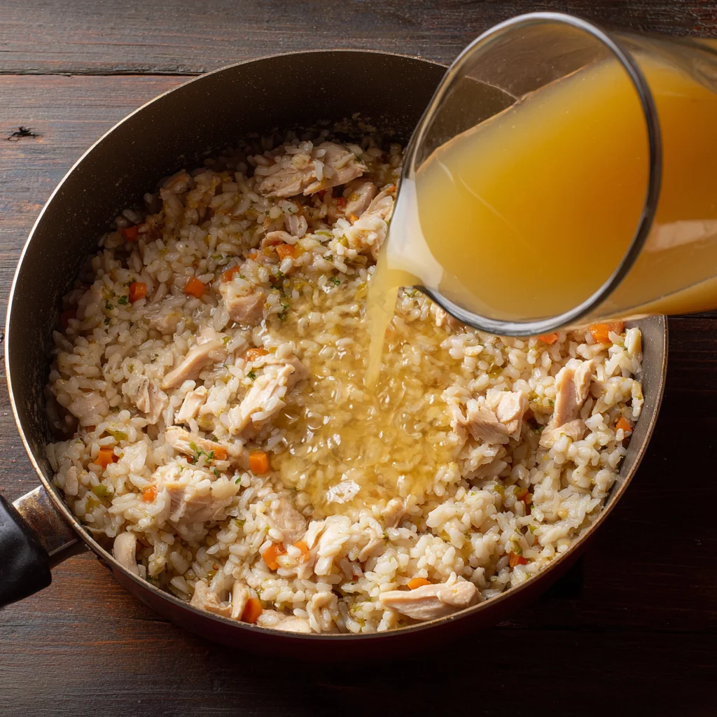 Pour in the chicken broth (or water) and bring the mixture to a boil. Once boiling, reduce the heat to low, cover the saucepan, and let it simmer for about 15 minutes or until the rice is cooked and the liquid is absorbed.