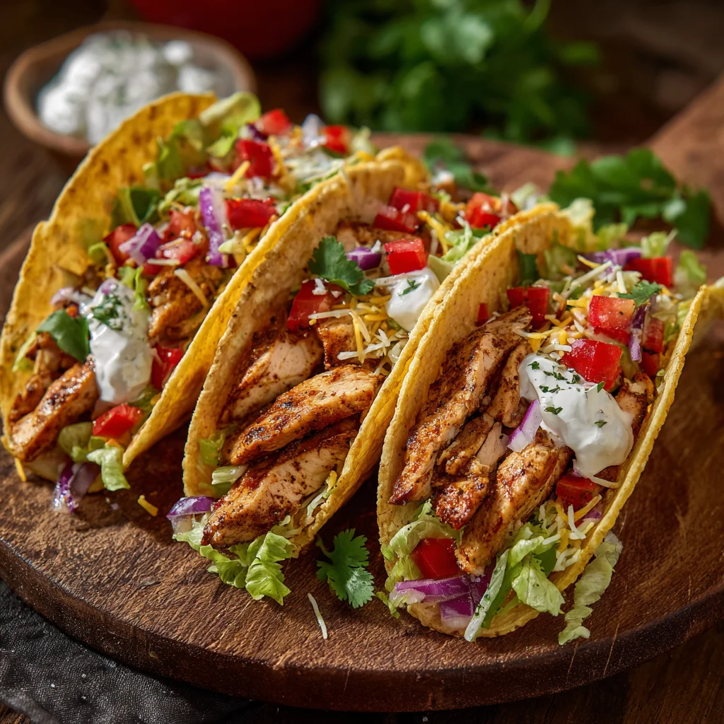 Once the chicken is sliced, it’s time to assemble your tacos. Place a tortilla on a plate, then add a generous portion of chicken strips. Top with shredded lettuce, diced tomatoes, red onions, and cheese. For an extra creamy touch, add a spoonful of sour cream or Greek yogurt. Garnish with fresh cilantro, and drizzle with salsa or your favorite hot sauce for some extra flavor.