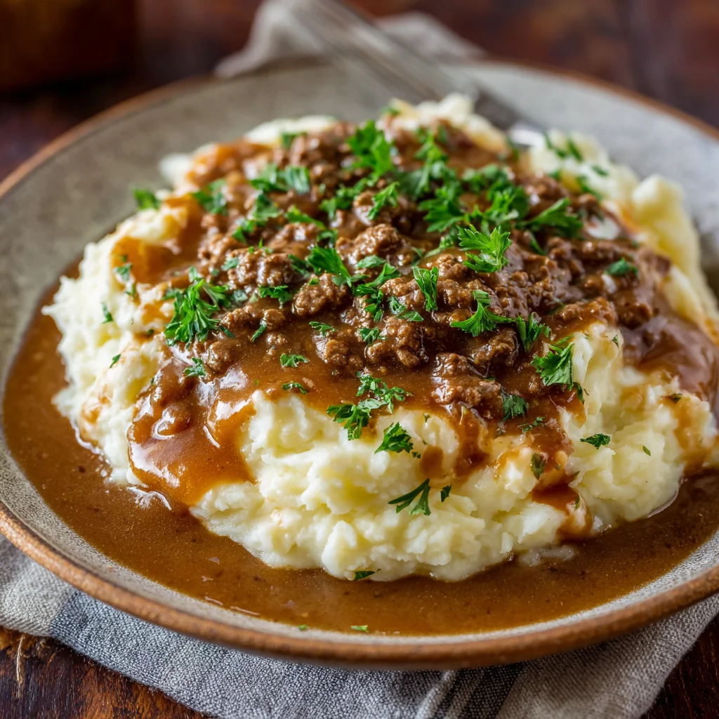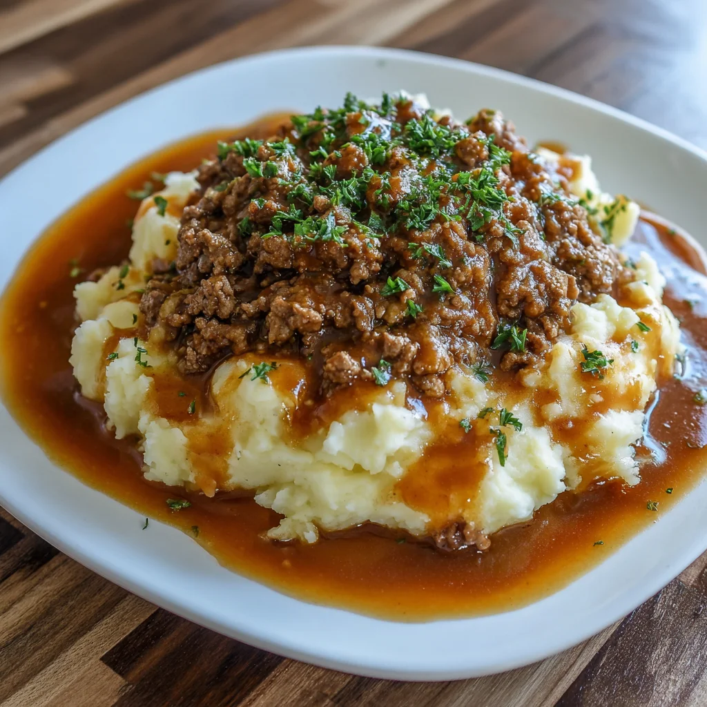 Spoon a generous portion of mashed potatoes onto each plate, then pour the savory ground beef and gravy mixture over the top. Garnish with fresh parsley if you like, and serve immediately.