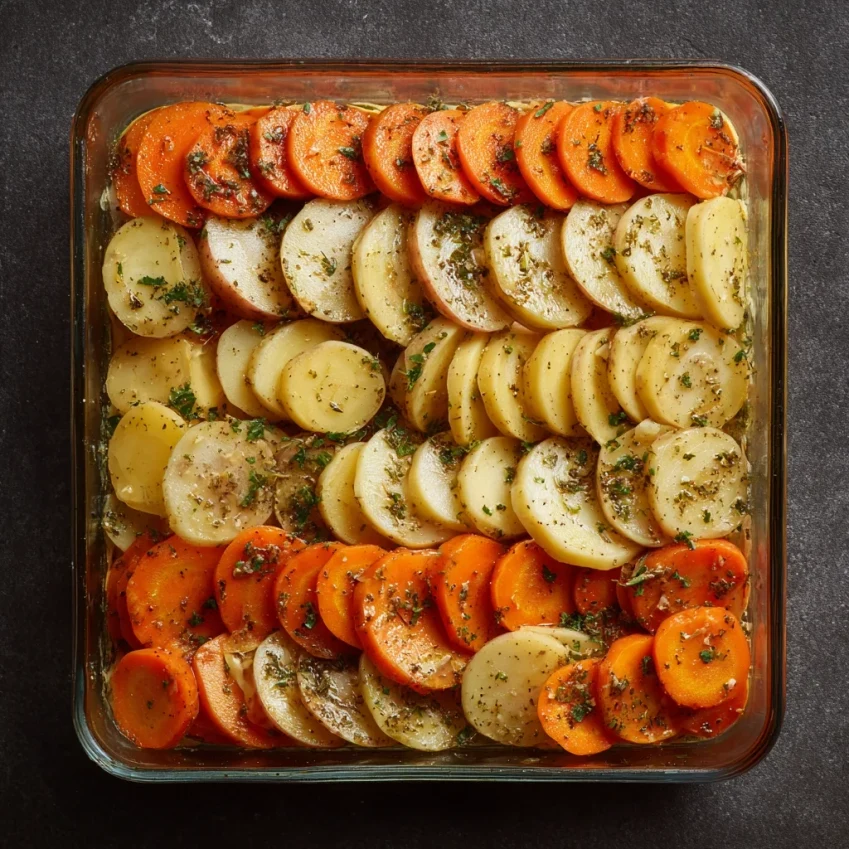 • Layer the sliced potatoes and carrots in the bottom of a greased 9×13-inch baking dish. These will form the base of the casserole.