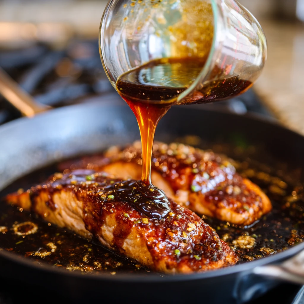 Pour that honey garlic sauce over the salmon. Cook for 2 more minutes. You want the salmon to reach about 135°F inside. It will finish cooking on the plate.