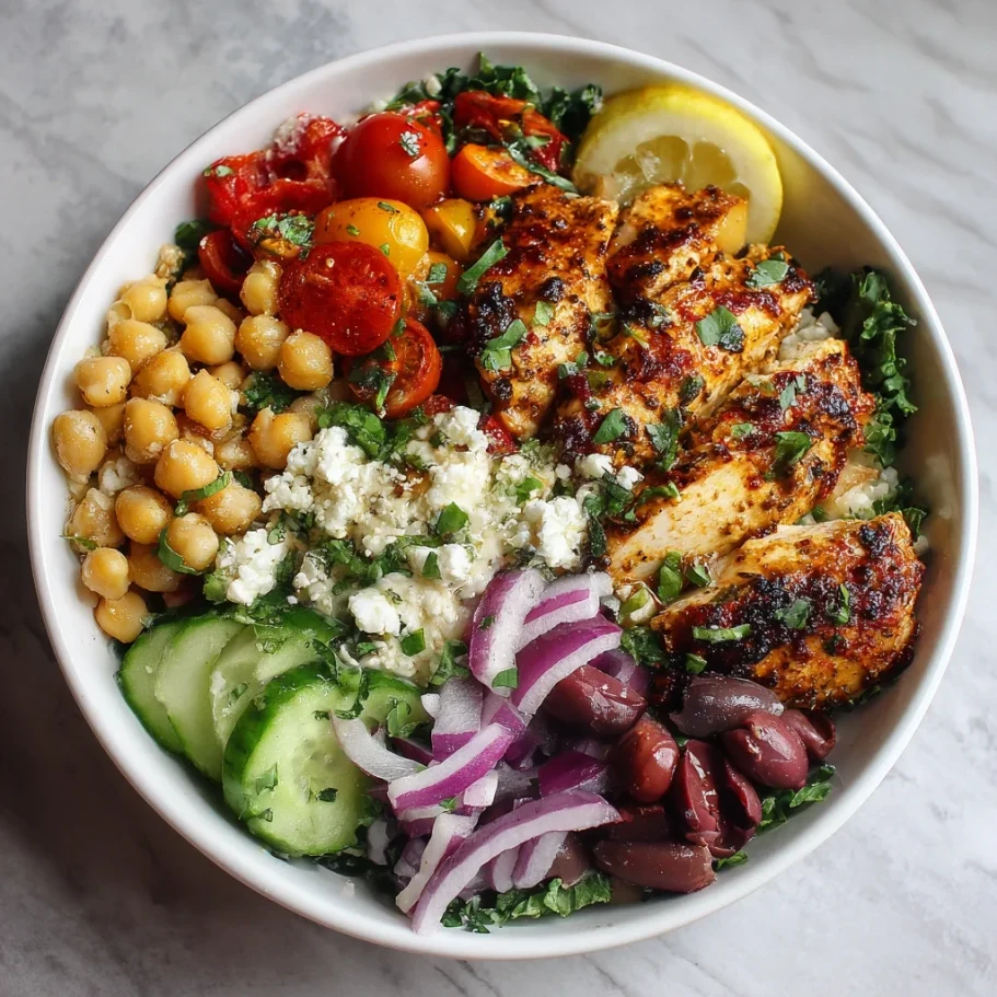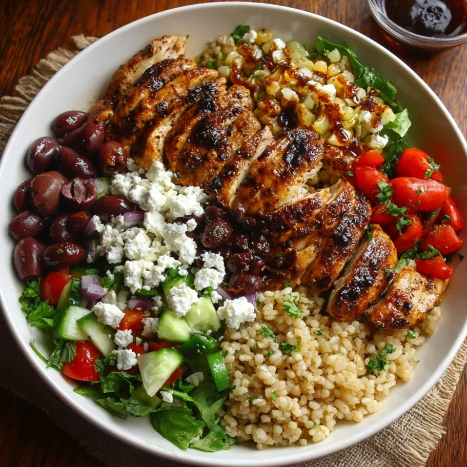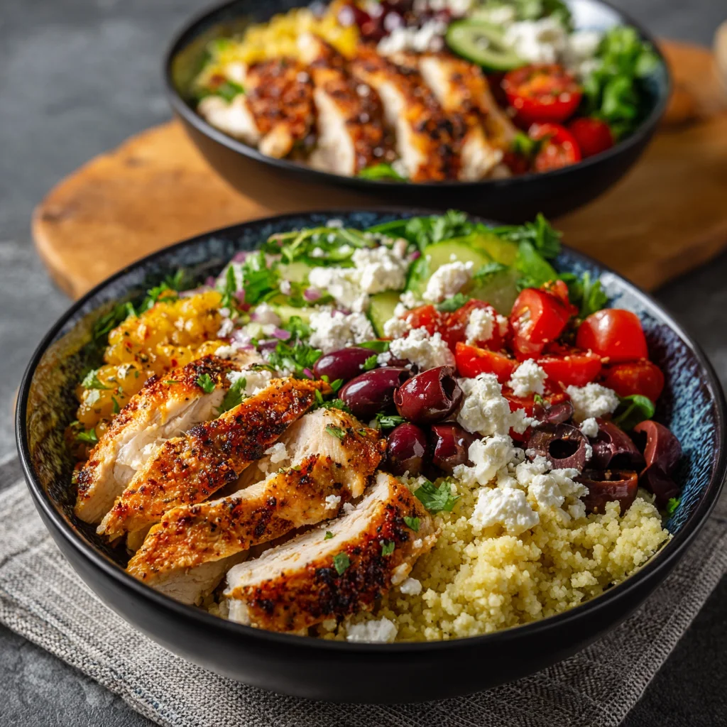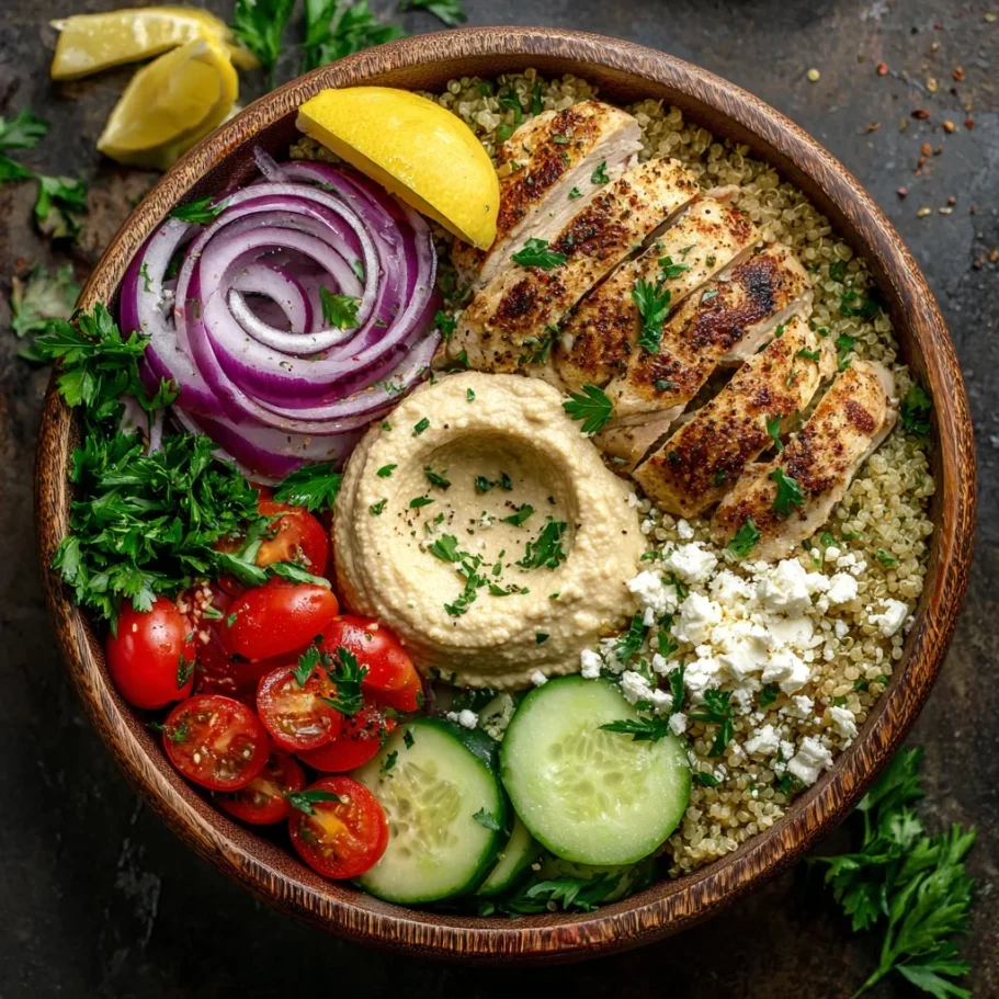 To assemble the bowls, start with a base of cooked quinoa (or your choice of grain). Arrange the sliced grilled chicken, cucumber, cherry tomatoes, red onion, Kalamata olives, and feta cheese on top. Add a generous dollop of hummus to each bowl, then drizzle with the dressing. Garnish with fresh parsley and serve with lemon wedges on the side for an extra burst of citrus.