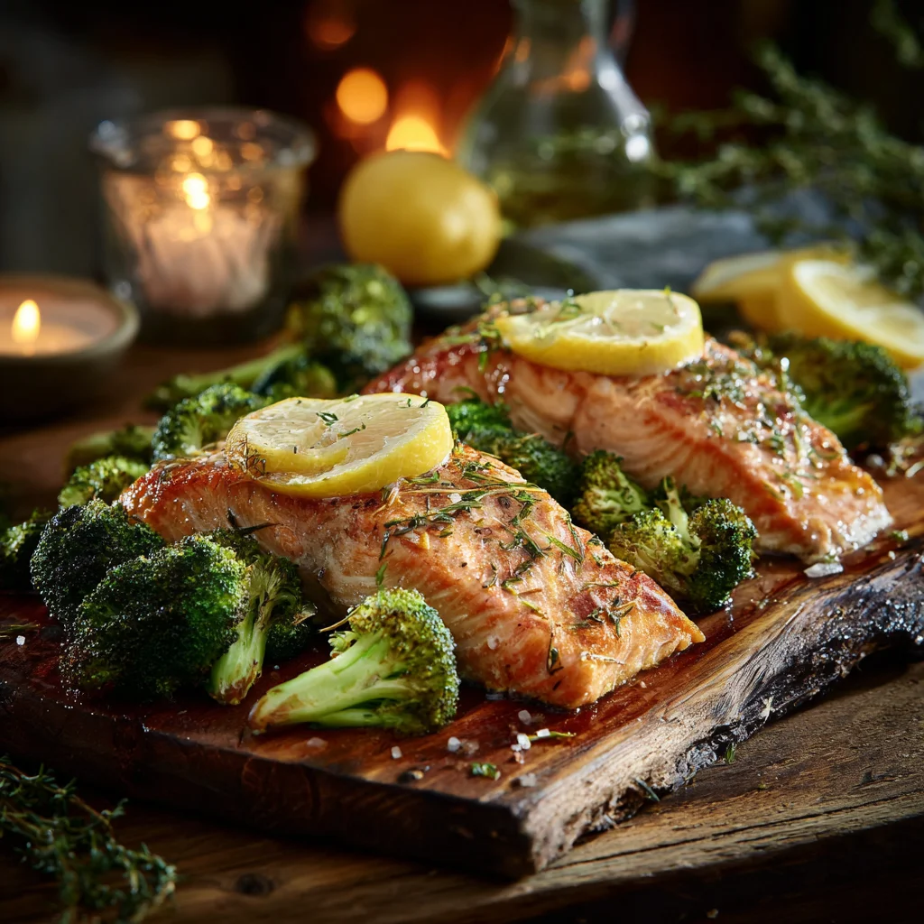 Image Prompt Idea: Plated roasted salmon with broccoli, herbs, lemon wedge, vibrant natural light.