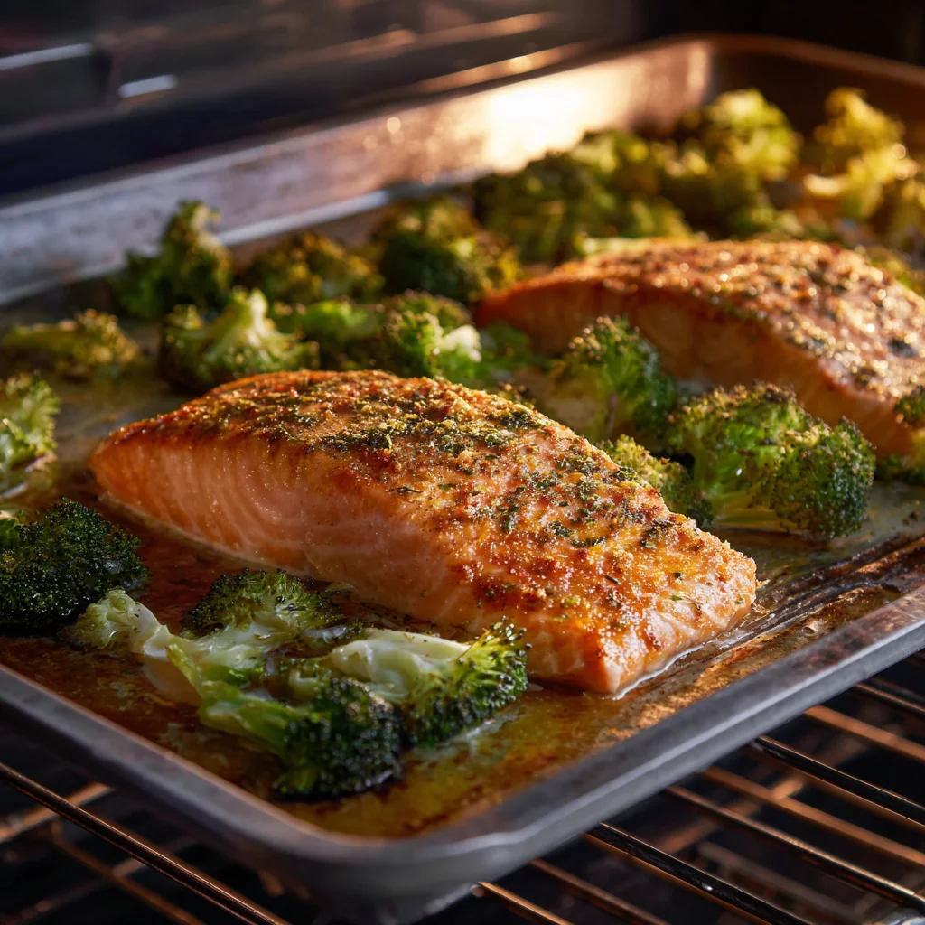 Image Prompt Idea: Salmon and broccoli roasting in oven, golden edges forming, steam visible.