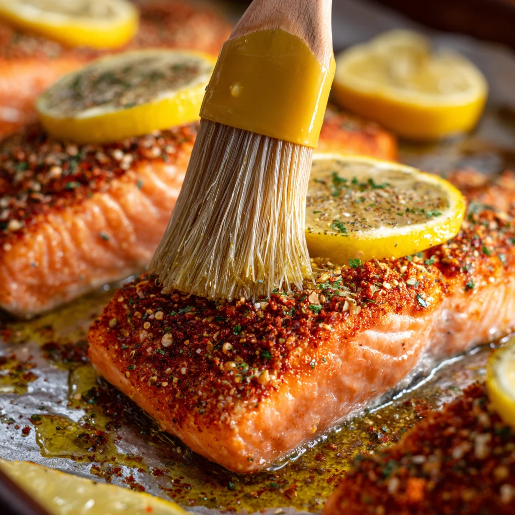 Image Prompt Idea: Close-up of salmon fillets being seasoned, lemon slices arranged, herbs sprinkled on top.