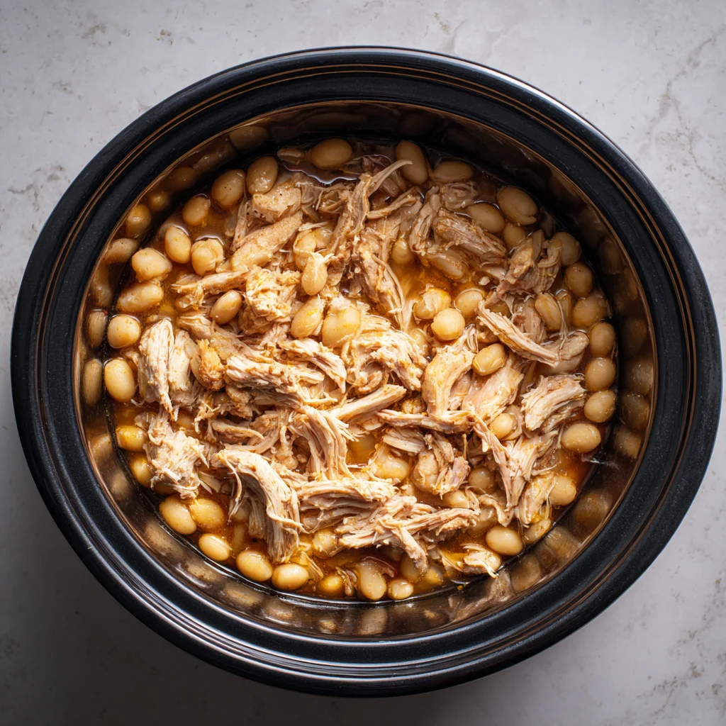 Once the chicken is fully cooked, remove it from the slow cooker and shred it with two forks. It should fall apart easily. Return the shredded chicken back into the slow cooker.