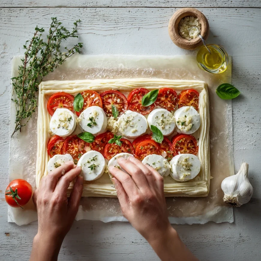 Next, arrange the sliced mozzarella evenly over the puff pastry. Layer the fresh tomatoes on top, placing them strategically to balance the flavors. Be sure not to overcrowd the tart, as it could cause the pastry to become soggy.
